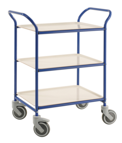 plateau(x) amovible. plateau(x) droit. châssis avec finition époxy résistante aux chocs et aux rayures en bleu. structure en acier. Manœuvre et déplacement aisés grâce à 4 roulettes pivotantes, 2 roulettes avec freins. Ø de roue 125 mm. roues avec bandage TPE préservant le sol. moyeu avec roulement à billes de précision. disposition des roues rectangulaire. Produit livré démonté – montage facile.Notre équipe du service clientèle se tient à votre disposition.