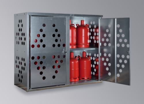 "longDescription": "<h2>Armoire pour bouteilles de gaz</h2><ul><li>Structure en tôle d'acier galvanisé</li></ul><br><h3>Portes :</h3><ul><li>Double porte battante</li><li>Poignée de porte avec serrure à cylindre, y compris 2 clés</li></ul><br><h3>Équipement :</h3><ul><li>Portes et parois latérales avec perforation d'aération</li><li>Paroi arrière et toit pleins</li><li>Avec tablette intermédiaire amovible</li></ul><br><h3>Norme/Directive/Ordonnance :</h3><ul><li>Conformité aux réglementations techniques pour gaz comprimés TRGS 510</li></ul><br><h3>Convient pour :</h3><ul><li>Stockage en plein air</li></ul>",