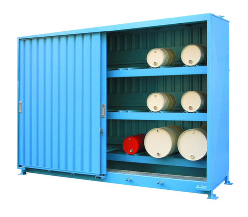 pour fût 24 x 200 litres maximum, entreposage horizontal. pour stockage en plein air. Convient pour substances dangereuses pour l'eau et inflammables. construction du conteneur agréée par les autorités.