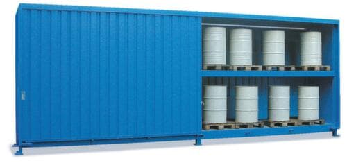 "description": "max. fût 48x200l, vertical, HxlxP 4480x8100x1530mm, a. porte coulissante, 2xcaillebotis de sol, tablette de rétention 800l, acier, RAL 5015",