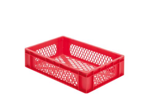 dimensions adaptées aux palettes européennes. en polypropylène incassable en rouge. Parois ajourés, fond ajourés. Plusieurs niveaux gerbable. convient pour aliments. Adapté aux convoyeurs à rouleaux. Résistant à la température -20 °C à +80 °C. Convient pour différents tissus, nous consulter.