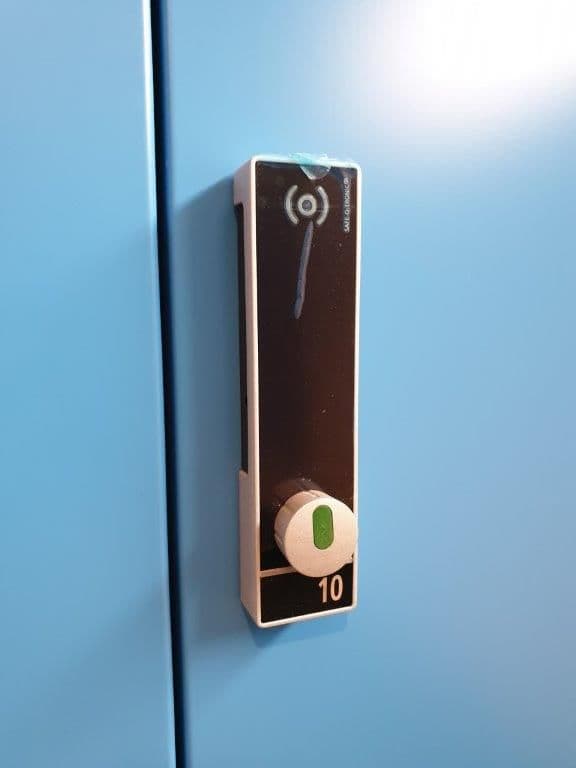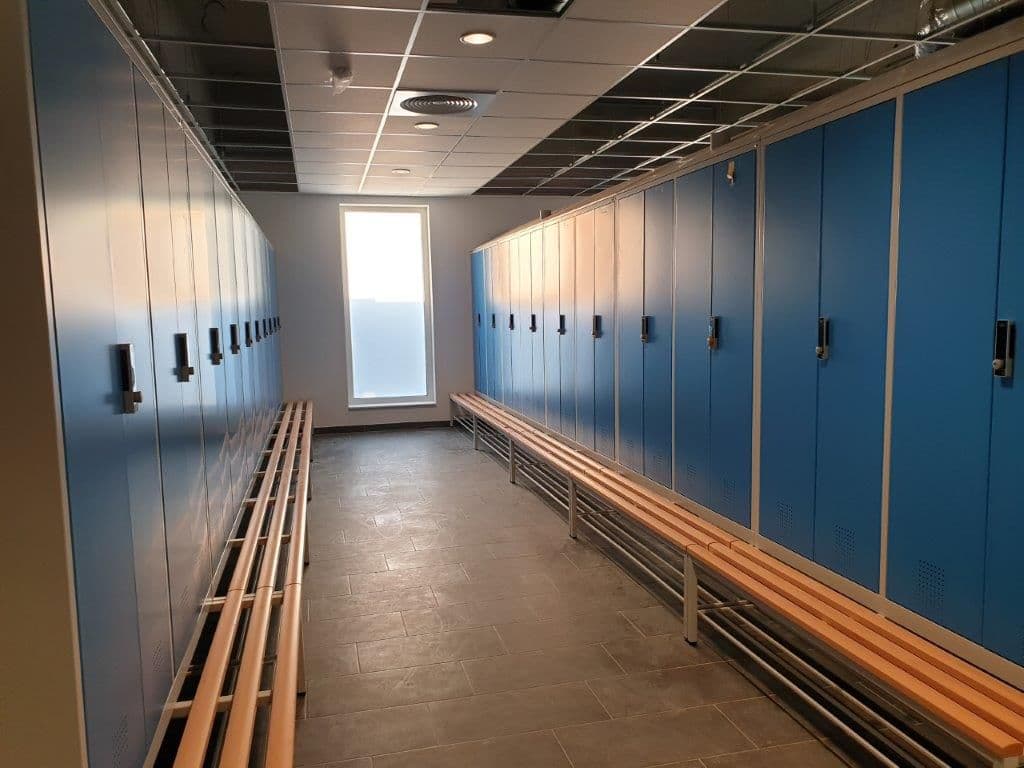 Lors de la consultation du projet sur place, la solution produit suivante a été définie avec le consultant d'UDO BÄR : 97 armoires avec banc et étagère à chaussures en dessous. Chaque armoire est composée de 2 compartiments de 400 mm de côté avec des portes communes verrouillables, avec une cloison au milieu, une étagère à chapeau continue et une tringle à vêtements avec 3 crochets coulissants. Équipements spéciaux : système de fermeture électronique, toits inclinés avec volets en tôle (système de ventilation).