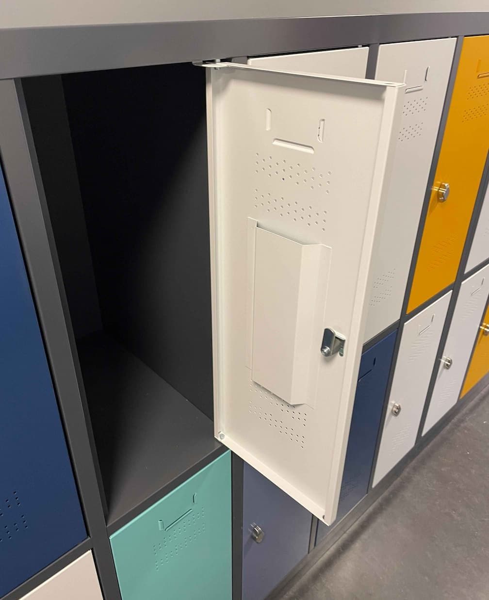 Lors des discussions sur le projet sur place, le consultant d'UDO BÄR a discuté des avantages de la hauteur demandée de 185 cm pour une école primaire, car une hauteur totale inférieure serait certainement plus pratique pour que les élèves puissent atteindre les compartiments supérieurs - ceci a été accepté. Des armoires à 2, 3 et 4 compartiments juxtaposés et à 2 compartiments superposés ont été proposées, d'une hauteur de 1 685 mm, avec plinthe, toit incliné, portes avec trous de ventilation, porte-étiquette, limiteur d'ouverture et serrure à loquet rotatif. Portes et carcasse dans des couleurs spéciales avec une spécification de l'architecte "door-wise" pour la division des couleurs des portes.
