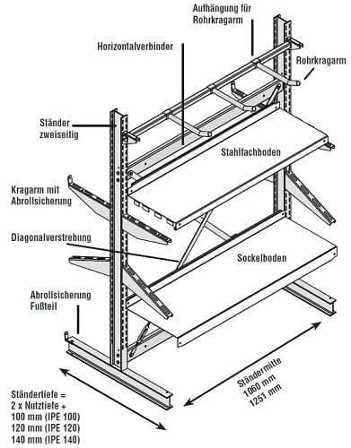 Vous y trouverez également un aperçu des différentes possibilités. Avez-vous besoin de bras en porte-à-faux avec protection contre le renversement ou préférez-vous qu'ils n'en aient pas ? Des capacités de charge de 140 à 550 kg sont également possibles, ainsi qu'une profondeur des différents bras en porte-à-faux pouvant atteindre 600 m pour les étagères les plus grandes. Cependant, nous disposons également de bras en porte-à-faux tubulaires et des suspensions correspondantes, mais leur capacité de charge est nettement inférieure à celle des bras en porte-à-faux standard et moyens.