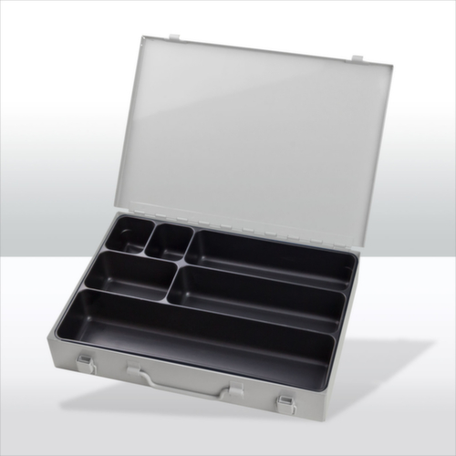 Verrouillable par 2 fermetures à grenouillère. équipé de compartimentage amovible. avec Poignée de transport. mallette en tôle d'acier / bacs en plastique. mallette avec finition époxy résistante aux chocs et aux rayures en RAL7035 gris clair. bacs en noir.