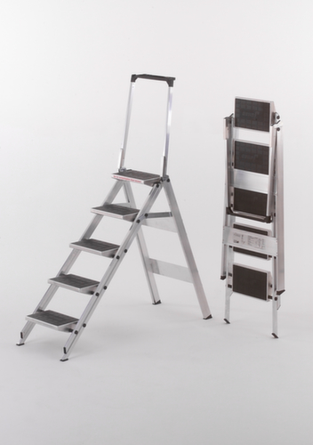 "longDescription": "<h2>Marche pliante</h2><strong>confortable et sûr pour chaque application</strong><br><ul><li>Montée très facile - peut être montée comme un escalier grâce à l'angle d'inclinaison confortable et aux marches extra larges.</li><li>Stable - extrémités de la barre avec pieds d'échelle antidérapants</li><li>Léger et robuste - fabriqué en aluminium</li></ul> <br><h3>Vous avez le choix :</h3><ul><li>Encore plus de sécurité - avec une barre de sécurité repliable comprenant un plateau de rangement et un crochet pour seau des deux côtés.</li><li>Marches avec revêtement plastique antidérapant ou en damier</li></ul><br>L'escabeau Little Jumbo offre un haut niveau de stabilité grâce à sa conception conique et large. La construction robuste porte la marque GS et bénéficie d'une garantie de 5 ans. <br><br>Choisissez parmi différentes hauteurs, nombre de marches, surface de marche et barre de sécurité. La surface de la marche est soit en damier, soit avec un revêtement en caoutchouc. Tous deux assurent une assise sûre et stable sur l'échelle. Il peut être escaladé d'un côté et peut donc être emprunté comme un escalier. Cette échelle peut être commandée avec ou sans support de sécurité, le support étant toujours inclus à partir d'une version à trois marches. Un grand plateau de rangement pour les outils ou autres objets similaires et des crochets pour seaux des deux côtés y sont intégrés, de sorte que tout ce qui est nécessaire pour travailler avec cette échelle pliante est directement à portée de main.<br><br>Grâce à sa nature en aluminium, il est très maniable, car il ne pèse pas lourd. Néanmoins, l'échelle peut être chargée jusqu'à 150 kg. De grands sabots en plastique nervurés sont intégrés aux extrémités des montants, ce qui permet de se tenir debout en toute sécurité, même sur des sols humides.<br><br><strong>Critères de qualité</strong><br><ul><li>Assurance qualité conform. à DIN EN 14183</li><li>VDL</li></ul>",