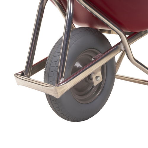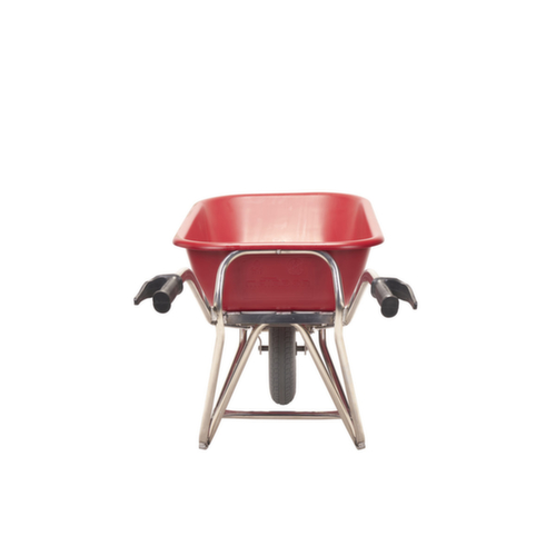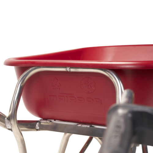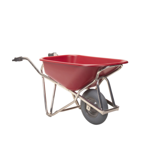 Benne en polyéthylène haute pression coloris rouge. structure en aluminium. Poignées de sécurité avec protection des jointures maintenant le poignet droit et empêchant sa flexion de manière à porter la charge avec 4 doigts au lieu de 2 seulement. roue avec bandage polyuréthane increvable sur jante acier inoxydable. moyeu avec roulement à billes robuste à double étanchéité.