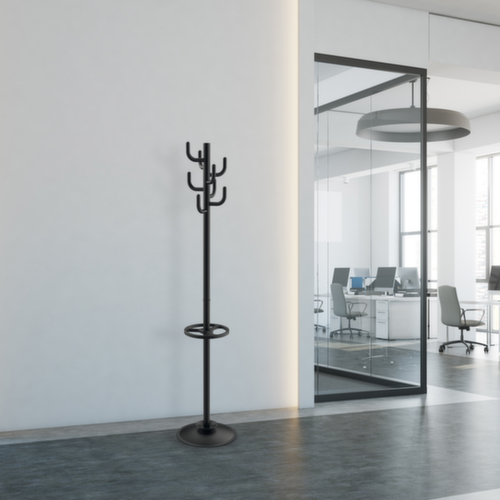"title": "MAUL Portemanteau MAULpolaris avec porte-parapluies, avec 8 crochets, noir de sécurité RAL9004",
