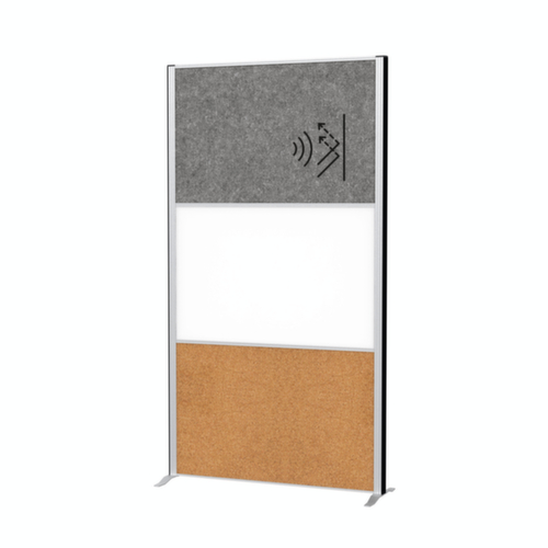 à poser au sol. paroi en non tissé en polyester (paroi acoustique), tôle d'acier (tableau blanc) et liège coloris gris foncé/blanc/marron (divisée en 1 cloison en gris foncé, tableau blanc et élément en liège marron). surface pour punaises et magnétique. cadre en aluminium en argent. soubassement avec pied avec fonction de nivellement pour compenser les inégalités du sol. Extensible à tout moment : Il est possible de juxtaposer sans interruption plusieurs cloisons démontables grâce au système à boucles et crochets.