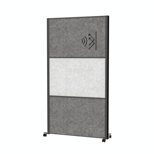 à poser au sol. paroi en non-tissé polyester (matériau d'isolation optimal) coloris gris foncé/gris clair (divisé en 2 parois en gris foncé et 1 paroi en gris clair). surface punaisable. cadre en aluminium en anthracite. soubassement avec roulettes à frein. Extensible à tout moment : Il est possible de juxtaposer sans interruption plusieurs cloisons démontables grâce au système à boucles et crochets.