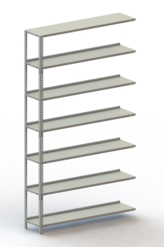 les principales dimensions du META rayonnage pour classeurs en un coup d’œil :Vous pourrez organiser au mieux vos dossiers, classeurs et autres outils de bureau sur 7 niveau(x) avec tablettes en tôle d’acier de qualité / 7 hauteurs de classeur. hauteurs de compartiments réglables par pas de 25 mm selon l’usage prévu et vos besoins. niveaux avec rebord antichute arrière contre la chute de classeurs. les canaux longitudinaux en forme de M à 5 pliages garantissent un degré élevé de stabilité et de protection contre les blessures. utilisation unilatéral - conçu pour un montage mural. structure en acier, montants avec revêtement en zinc anti-corrosion, niveaux avec revêtement en zinc anti-corrosion.