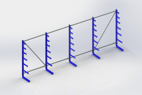 les principales dimensions du META du META rayonnage cantilever Atlas ST Atlas ST en un coup d’œil :utilisation unilatéral - conçu pour un montage mural. 7 niveaux de stockage. 6 niveaux avec bras, avec rebord antichute. force par bras 150 kg. Bras de longueur différente de forme conique, positionnement droit. profondeur utile 150 mm. structure en acier. montants décapé au jet de sable et finition peinture époxy en RAL5010 bleu gentiane. bras décapé au jet de sable et finition peinture époxy en RAL5010 bleu gentiane.