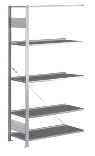 pour votre sécurité : selon DIN EN 15635, il est impératif de sécuriser et de fixer au sol les rayonnages à tablettes dont la hauteur correspond au moins à quatre fois la profondeur du rayonnage (rapport 4:1). les charges max. par tablette indiquées s’entendent pour une répartition uniforme de la charge. des tablettes/niveaux supplémentaires sont disponibles jusqu’à la charge max. par élément.