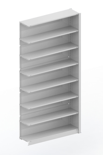 les principales dimensions du META du META rayonnage pour classeurs en un coup d’œil :Espace de rangement facilement accessible pour les dossiers et documents de travail sur 7 hauteurs de classeur. les tablettes sont emboîtées et leur agencement peut donc être modifié à tout moment. canal longitudinal en forme de M, 5 pliages et soudé pour un degré élevé de stabilité et de protection contre les blessures. construction en acier avec finition époxy résistante aux chocs et aux rayures. grande stabilité en longueur et en profondeur grâce aux parois arrière et latérales pleines. corps en RAL7035 gris clair. niveaux en RAL7035 gris clair.