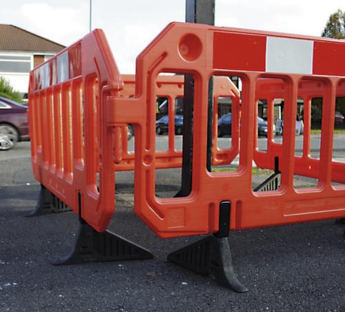 "longDescription": "<h2>Barrières légères</h2><strong>Signal d'avertissement pour les chantiers, les routes et les événements</strong><br><ul><li><strong>Pas de risque de trébuchement</strong> - les pieds supports côté piétons sont raccourcis</li><li><strong>Transport peu encombrant</strong> grâce aux pieds supports rotatifs</li><li><strong>Montage sans fin grâce au principe de crochet et d'œillet</strong></li><li><strong>Effet de signalisation</strong> - dans une couleur d'avertissement avec bandes réfléchissantes</li><li><strong>Extrêmement résistant</strong> - fabriqué en polyéthylène haute pression (HDPE)</li></ul>",