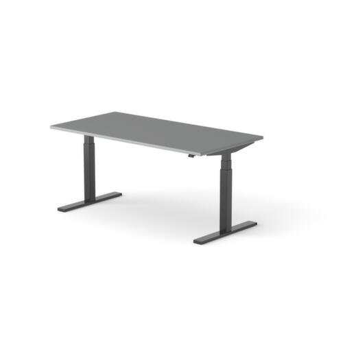 panneau en aggloméré avec revêtement mélaminé, facile d’entretien finition MS Slate. forme de panneau rectangulaire. piètement en T en RAL9005 noir foncé. réglage en hauteur via moteur électrique avec transmission manuelle. avec fiche Euro.