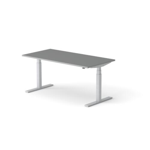 panneau en aggloméré avec revêtement mélaminé, facile d’entretien finition MS Slate. forme de panneau rectangulaire. piètement en T en RAL9006 aluminium blanc. réglage en hauteur via moteur électrique avec transmission manuelle. avec fiche Euro.