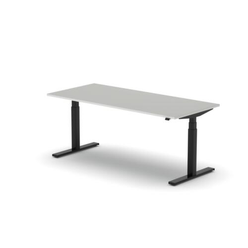 panneau en aggloméré avec revêtement mélaminé, facile d’entretien finition MB White Grey. forme de panneau rectangulaire. piètement en T en RAL9005 noir foncé. réglage en hauteur via moteur électrique avec transmission manuelle. avec fiche Euro.