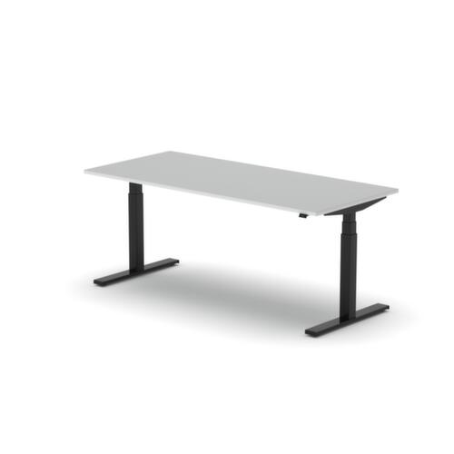 panneau en aggloméré avec revêtement mélaminé, facile d’entretien finition BI White. forme de panneau rectangulaire. piètement en T en RAL9005 noir foncé. réglage en hauteur via moteur électrique avec transmission manuelle et affichage. fonctions : Mémorisation et rappel automatique des hauteurs de table programmées grâce à la fonction mémoire. avec fiche Euro.