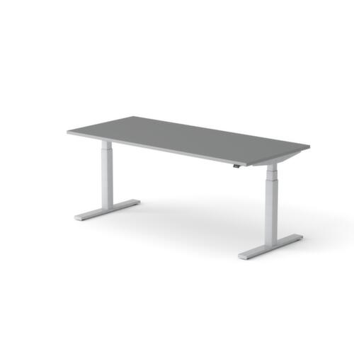 panneau en aggloméré avec revêtement mélaminé, facile d’entretien finition MS Slate. forme de panneau rectangulaire. piètement en T en RAL9006 aluminium blanc. réglage en hauteur via moteur électrique avec transmission manuelle. avec fiche Euro.