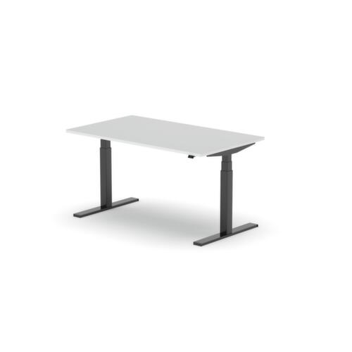 panneau en aggloméré avec revêtement mélaminé, facile d’entretien finition BI White. forme de panneau rectangulaire. piètement en T en RAL9005 noir foncé. réglage en hauteur via moteur électrique avec transmission manuelle. avec fiche Euro.
