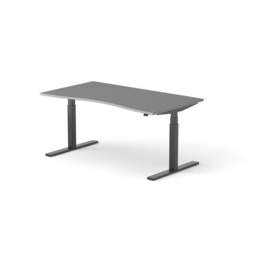 panneau en aggloméré avec revêtement mélaminé, facile d’entretien finition MS Slate. forme de panneau oscillé. piètement en T en RAL9005 noir foncé. réglage en hauteur via moteur électrique avec transmission manuelle. avec fiche Euro.