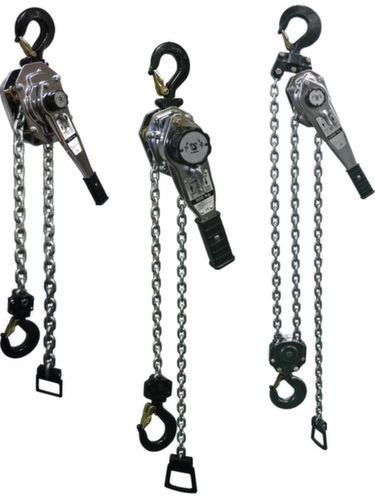 "longDescription": "<h2>Levier de levage</h2><strong>Version Premium</strong><br><ul><li>Frein de sécurité à pression de charge avec deux cliquets</li><li>Crochets supérieurs et inférieurs avec loquets de sécurité</li><li>Crochet de sécurité en fonte</li><li>Standard avec chaîne de charge de 1,5 m, haute résistance selon DIN EN 818-7-T, trempée et galvanisée.</li></ul><br><h3>Ergonomie :</h3><ul><li>Soulever, tirer et tendre dans toutes les positions et dans toutes les directions.</li><li>Levier de déverrouillage pour une traction rapide de la chaîne à l'état non chargé.</li><li>Grande manivelle fermée et facile à saisir.</li><li>Levier manuel, prise en main très sûre et toujours engagée grâce au cliquet.</li></ul><br>Le palan à levier est l'étape suivante dans le développement de la série Premium. Le boîtier est en tôle d'acier chromée et tous les points de connexion sont galvanisés. En raison de la résistance extraordinairement élevée et de la très faible résistance au frottement, le palan à levier a une très longue durée de vie. Malgré le renforcement supplémentaire des boîtiers d'engrenages et de freins, le gain de poids est important, ce qui améliore considérablement la tenue de route.<br>",