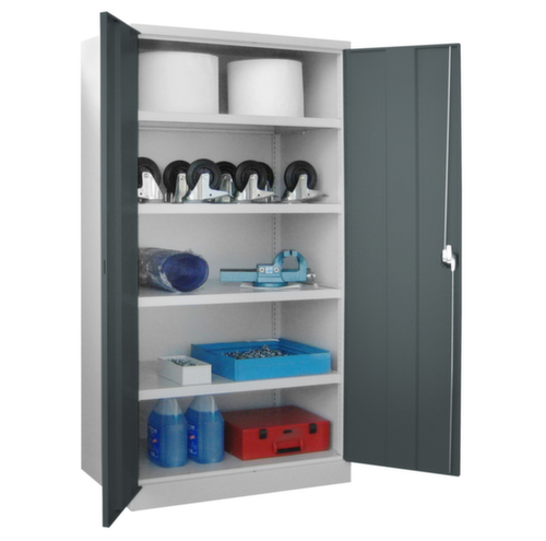 les principales dimensions de l’PAVOY armoire universelle Basis en un coup d’œil :Le corps de l’armoire est fabriqué en tôle d'acier et soudé de manière stable. Cela rend la structure particulièrement robuste et résistante, et donc plus durable. Les coins et les angles soudés du corps garantissent une plus grande étanchéité et donc une meilleure protection contre la poussière, l’humidité et la saleté qu’une structure vissée. En outre, il n’est pas nécessaire de procéder à des travaux d’entretien réguliers ni à des réajustements. Grande flexibilité de l’aménagement intérieur grâce à la possibilité de régler la hauteur du compartiment par pas de 25 mm. équipé de tablettes. double porte battante. Les portes à fermeture encastrée à fleur du corps n’ont pas de bords saillants contre lesquels quelqu’un pourrait se cogner et ne permettent pas à la poussière se déposer. Les portes sont encore renforcées par le profilé en caisson intérieur. l’armoire en acier s’ouvre avec poignée tournante. verrouillable avec serrure à cylindre. Le verrouillage 3 points offre une grande stabilité et une protection anti-effraction efficace. Le socle encastré permet de répartir uniformément le poids de l’armoire sur le sol. Cela augmente la stabilité et l’armoire peut supporter des charges plus lourdes qu’une armoire à pieds. De plus, la saleté, la poussière et l’humidité ne peuvent pas s’infiltrer sous l’armoire, ce qui réduit la surface de nettoyage.