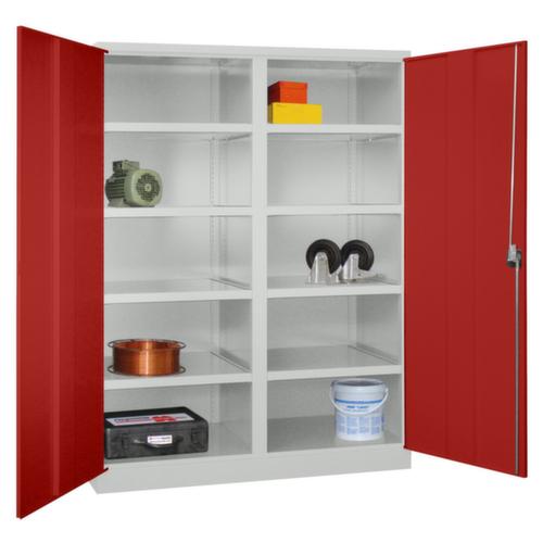 les principales dimensions de l’PAVOY armoire universelle Basis en un coup d’œil :Le corps de l’armoire est fabriqué en acier et soudé de manière stable. Cela rend la structure particulièrement robuste et résistante, et donc plus durable. Les coins et les angles soudés du corps garantissent une plus grande étanchéité et donc une meilleure protection contre la poussière, l’humidité et la saleté qu’une structure vissée. En outre, il n’est pas nécessaire de procéder à des travaux d’entretien réguliers ni à des réajustements. La cloison de séparation médiane divise les niveaux en deux compartiments séparés et permet ainsi d’organiser davantage l’espace de rangement pour différents objets. Équipé à gauche de 4 tablettes, à droite de 4 tablettes. Grande flexibilité de l’aménagement intérieur grâce à la possibilité de régler la hauteur du compartiment par pas de 25 mm. équipé de tablettes. double porte battante. Les portes à fermeture encastrée à fleur du corps n’ont pas de bords saillants contre lesquels quelqu’un pourrait se cogner et ne permettent pas à la poussière se déposer. Les portes sont encore renforcées par le profilé en caisson intérieur. l’armoire en acier s’ouvre avec poignée tournante. verrouillable avec serrure à cylindre. Le verrouillage 3 points offre une grande stabilité et une protection anti-effraction efficace.