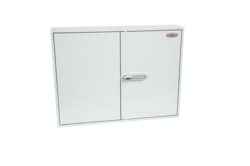 barres à crochets réglables, numérotées et dans plusieurs couleurs. Les anneaux porte-clés et les porte-étiquettes colorés créent ordre et transparence dans l'armoire. Fermeture avec protection contre la poussière via une porte à double battant. verrouillable avec serrure électronique à code programmable avec un code utilisateur personnalisé à 4 chiffres et aisément modifiable selon les besoins. structure en acier. corps avec finition époxy résistante aux chocs et aux rayures en gris. face avant avec finition époxy résistante aux chocs et aux rayures en gris. Préparé pour ancrage de la paroi arrière.