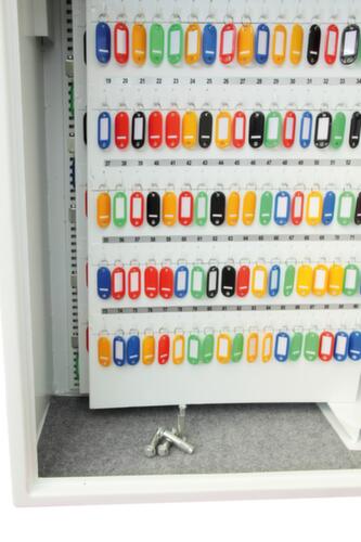 équipé de d'un dispositif de contournement de clé par précaution, en cas d'égarement du code. Les anneaux porte-clés et les porte-étiquettes colorés créent ordre et transparence dans l'armoire. porte à battants. verrouillable avec serrure électronique anti-manipulations. structure en acier. corps avec revêtement antirayures en RAL9003 blanc de sécurité. face avant avec revêtement antirayures en RAL9003 blanc de sécurité. Préparé pour ancrage de la paroi arrière.