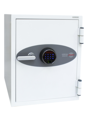 Tablette à hauteur réglable, tiroir verrouillable et crochet à clés. avec porte à battants. verrouillable avec serrure à clavier numérique tactile et capteur d'empreintes digitales avec affichage à DEL pour 32 empreintes digitales, indicateur de charge de la batterie, alarme interne, codes multi-utilisateur, mode dual et code aléatoire. Avec verrouillage rapide automatique. structure en acier. corps avec laquage en RAL9003 blanc de sécurité. face avant avec laquage en RAL9003 blanc de sécurité.