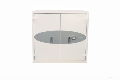 Tablettes à hauteur réglable munies de série de rails standard pour dossiers suspendus. avec double porte battante. verrouillable avec serrure électronique haute sécurité de classe VdS II avec double commande, code Maître et temporisation. structure en acier. corps avec laquage en RAL9003 blanc de sécurité. face avant avec laquage en RAL9003 blanc de sécurité.