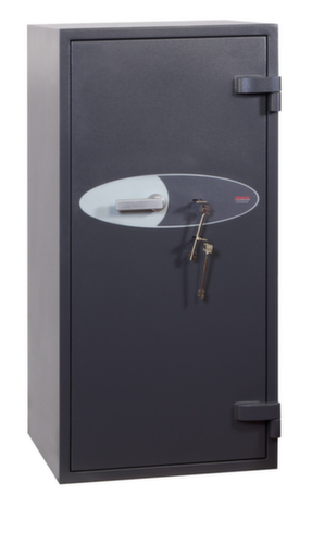 équipement : tablettes. avec porte à battants. verrouillable avec 2 serrures pour clé à double panneton haute sécurité de classe VdS II. verrouillage par des boulons de verrouillage angulaire 3 voies pour une grande robustesse. La structure à double paroi avec béton de remplissage à formule spéciale, les plaques antiperçage et la protection anti-reverrouillage confèrent un degré de résistance très élevé au coffre de sécurité. structure en acier. corps avec revêtement antirayures en RAL7024 gris graphite. face avant avec revêtement antirayures en RAL7024 gris graphite. Préparé pour ancrage de tablette / de panneau arrière.