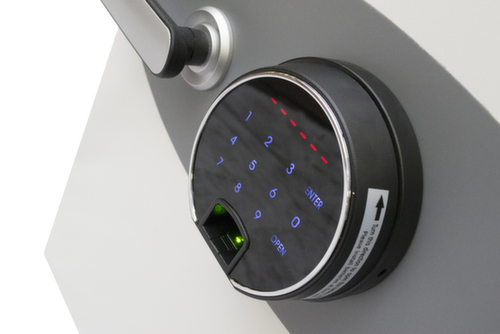 1 tiroir, 2 tablettes et 5 crochets à clés. avec porte à battants. verrouillable avec serrure à clavier numérique tactile et capteur d'empreintes digitales avec affichage à DEL pour 32 empreintes digitales, indicateur de charge de la batterie, alarme interne, codes multi-utilisateur, mode dual et code aléatoire. Verrouillage automatique de la porte à la fermeture pour une sécurité immédiate. structure en acier. corps avec laquage en RAL9003 blanc de sécurité. face avant avec laquage en RAL9003 blanc de sécurité.