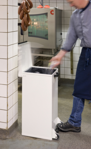 Les principales dimensions de la poubelle Carro Kick en un coup d'œil :à poser au sol. bac résiste au feu. Avec couvercle rabattable - l’ouverture s’effectue avec pédale pour protéger le dos. À fermeture amortie pour une ambiance de travail calme. Vidage facile par couvercle. corps en aluminium blanc. couvercle en aluminium blanc. Afin de pouvoir utiliser le bac de manière mobile, ce dernier est équipé de 2 roulettes.