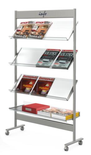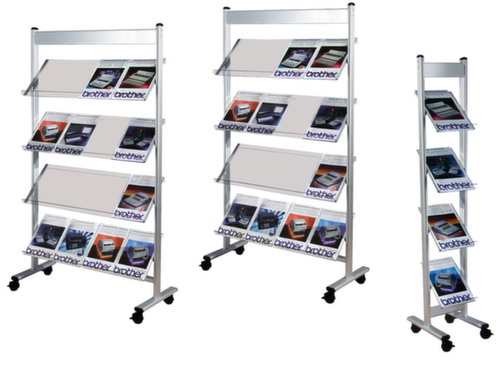 "longDescription": "<h2>Rayonnage pour brochures mobile</h2><strong>pour une présentation claire des informations</strong><br><ul><li><strong>Protection contre la poussière</strong> - tablettes porte-brochures en verre acrylique</li><li><strong>Bon maintien</strong> - avec rebord antichute</li><li>Robuste et résistant aux chocs - construction robuste en acier avec revêtement en poudre</li><li><strong>Mobile dans toutes les directions</strong> - roulettes pivotantes doubles avec frein</li></ul><br><h3>Le choix vous appartient :</h3><ul><li><strong>Plus de surface de rangement</strong> - avec jusqu'à 16 tablettes porte-brochures</li></ul>",