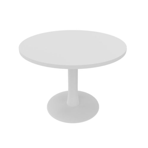 forme rond. piètement à disque en acier avec revêtement poudre époxy coloris blanc, colonne avec revêtement poudre époxy. tube rond. panneau en Panneau dérivé du bois avec revêtement mélaminé résistant à l'abrasion et à l'humidité finition blanc. épaisseur de panneau 30 mm. bord avec bande de chant ABS résistante aux chocs qui offre une protection contre les fissures et les éclatements disgracieux. bord du panneau blanc.