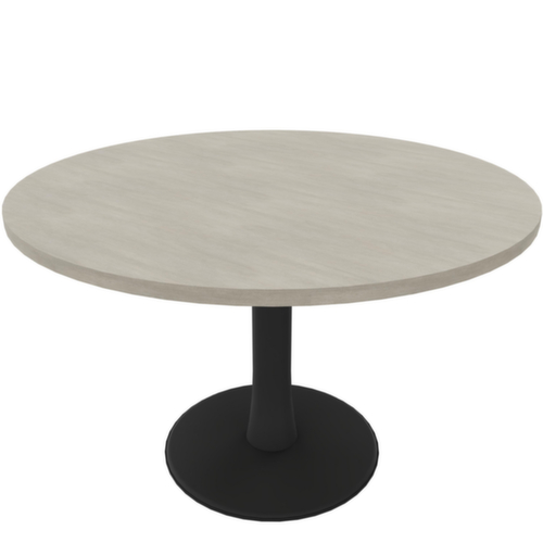 forme rond. piètement à disque en acier avec revêtement poudre époxy coloris gris foncé, colonne avec revêtement poudre époxy. tube rond. panneau en Panneau dérivé du bois avec revêtement mélaminé résistant à l'abrasion et à l'humidité finition béton. épaisseur de panneau 30 mm. bord avec bande de chant ABS résistante aux chocs qui offre une protection contre les fissures et les éclatements disgracieux. bord du panneau béton.