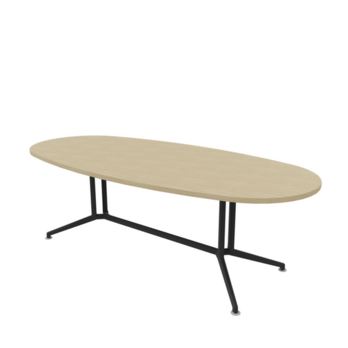 forme ovale. châssis en acier avec revêtement poudre époxy en gris foncé. tube carré et tube rond. châssis avec patins en plastique de mise à niveau, parfaits pour compenser les inégalités du sol. panneau en Panneau dérivé du bois avec revêtement mélaminé résistant à l'abrasion et à l'humidité finition chêne. épaisseur de panneau 30 mm. bord avec bande de chant ABS résistante aux chocs qui offre une protection contre les fissures et les éclatements disgracieux. bord du panneau chêne. traverses avec revêtement poudre époxy.