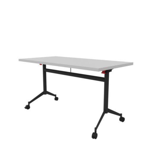 Lorsqu'il n'est pas utilisé, le panneau de table peut être basculé à 90° à l'aide de la poignée-barre et rangé. forme de panneau angulaire. piètement en T en métal avec revêtement poudre époxy en gris foncé. tube ovale. 4 roulettes sous le châssis assurent la mobilité nécessaire au quotidien. panneau en Panneau dérivé du bois avec revêtement mélaminé résistant à l'abrasion et à l'humidité finition gris. épaisseur de panneau 30 mm. Une bande de chant ABS résistant aux chocs protège tous les bords de fissures et d'éclatements inesthétiques. équipé de système à crochets et de verrouillage pour la liaison frontale et latérale de panneaux de table.