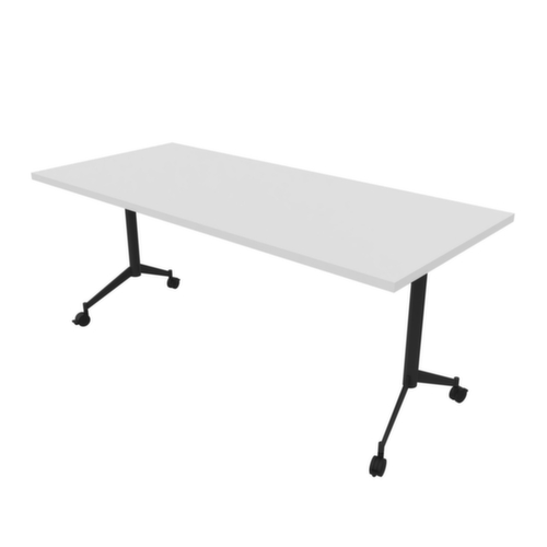 Lorsqu'il n'est pas utilisé, le panneau de table peut être basculé à 90° à l'aide de la poignée-barre et rangé. forme de panneau angulaire. piètement en T en métal avec revêtement poudre époxy en gris foncé. tube ovale. 4 roulettes sous le châssis assurent la mobilité nécessaire au quotidien. panneau en Panneau dérivé du bois avec revêtement mélaminé résistant à l'abrasion et à l'humidité finition blanc. épaisseur de panneau 30 mm. Une bande de chant ABS résistant aux chocs protège tous les bords de fissures et d'éclatements inesthétiques. équipé de système à crochets et de verrouillage pour la liaison frontale et latérale de panneaux de table.