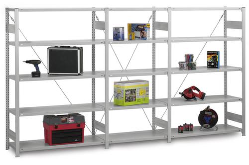 les principales dimensions du hofe rayonnage de stockage en un coup d’œil :3 éléments standard avec 5 niveau(x) chacun avec tablette en acier. 3 pliages de sécurité de 40 mm de hauteur et avec des coins pleins garantissent un degré élevé de stabilité et de protection contre les blessures. hauteurs de compartiments réglables par pas de 25 mm selon l’usage prévu et vos besoins. angle d'installation droit. utilisation unilatéral - conçu pour un montage mural. Stabilité élevée grâce aux croisillons. Les tôles de liaison en profondeur et les embases en acier confèrent une excellente stabilité au rayonnage. Les caches profilés supérieurs assurent une finition soignée. structure en acier, montants galvanisé avec revêtement en plastique en RAL7035 gris clair, niveaux galvanisé avec revêtement en plastique en RAL7035 gris clair.