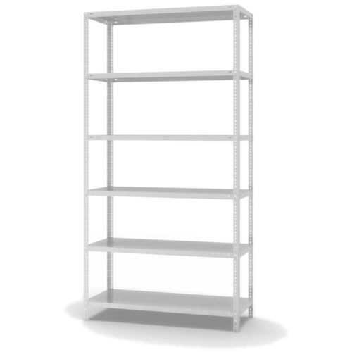 les principales dimensions du hofe rayonnage de stockage en un coup d’œil :6 niveaux avec tablette en acier. 3 pliages de sécurité de 40 mm de hauteur et avec des coins pleins garantissent un degré élevé de stabilité et de protection contre les blessures. hauteurs de compartiments réglables par pas de 25 mm selon l’usage prévu et vos besoins. utilisation unilatéral - conçu pour un montage mural. structure en acier, montants galvanisé avec revêtement en plastique en RAL7035 gris clair, niveaux galvanisé avec revêtement en plastique en RAL7035 gris clair.