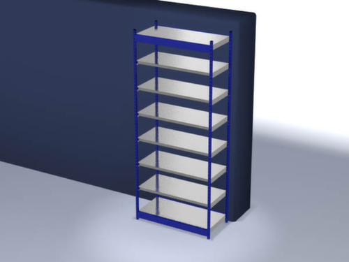 les principales dimensions du hofe rayonnage de stockage en un coup d’œil :7 niveaux avec tablette en acier. niveaux avec pliage de sécurité comme protection contre les blessures. 3 pliages de sécurité de 40 mm de hauteur garantissent un degré élevé de stabilité et de protection contre les blessures. hauteurs de compartiments réglables par pas de 50 mm selon l’usage prévu et vos besoins. angle d'installation droit. utilisation unilatéral - conçu pour un montage mural. Stabilité élevée grâce aux traverses longitudinales. structure en acier, montants avec revêtement en plastique résistant à l’usure en RAL5010 bleu gentiane, niveaux avec revêtement en zinc anti-corrosion.