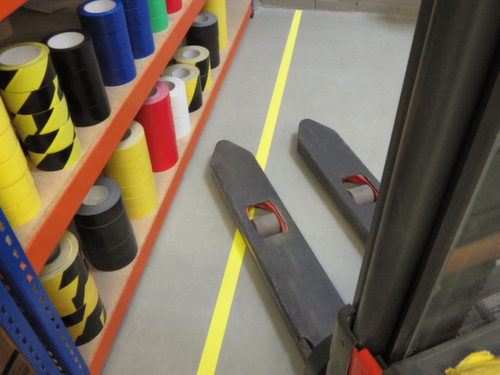 "longDescription": "<h2>Ruban de marquage au sol</h2><strong>pour les zones intérieures à fort trafic</strong><br><ul><li><strong>Marquage clair des zones à protéger</strong> telles que les voies de transport et les voies piétonnes</li><li><strong>Robustesse et couleurs intenses</strong> - En PVC teinté dans la masse, 3 couches</li><li><strong>Résistance à la température</strong> de -10 °C à +65 °C</li><li><strong>Maintien durable et sûr</strong> - Adhère à tous les sols propres, secs, dégraissés, fermés et à pores ouverts</li><li><strong>Simple en cas de restructuration</strong> - S’enlève facilement</li></ul>",