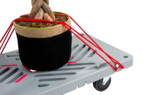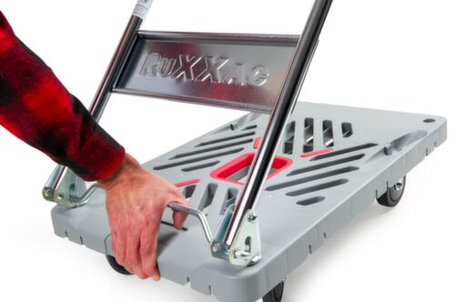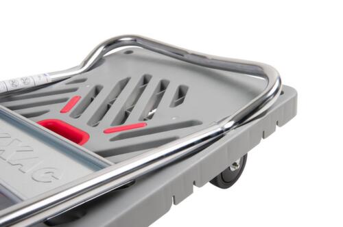 structure en acier (vissé). plateforme en plastique. plateforme ajourés avec ouverture de saisie dans le plateau. L'évidement au centre permet de saisir facilement et transporter le chariot à dossier plié sous le bras. plateforme imperméable. barre de poussée rabattable. châssis en gris. Les 2 roulettes pivotantes et les 2 roulettes fixes intégrées permettent un déplacement aisé avec une grande stabilité de trajectoire sur les lignes droites et dans les virages ne demandant que peu d'efforts. Ø de roue 130 mm. roues avec bandage caoutchouc plein avec bandage increvable garantissant la protection du sol.Notre équipe du service clientèle se tient à votre disposition.