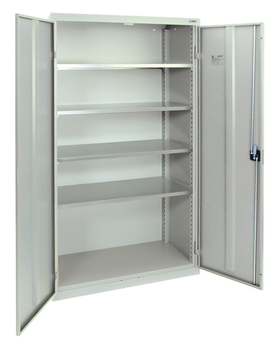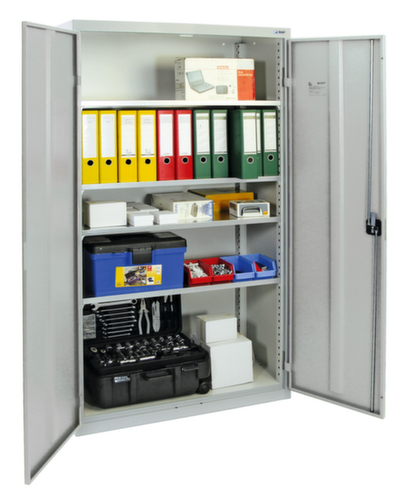 Fabriqué en tôle fine de qualité. Grande flexibilité de l’aménagement intérieur grâce à la possibilité de régler la hauteur du compartiment par pas de 25 mm. équipé de tablettes. La porte à double battant facilite particulièrement l’accès au contenu de l’armoire. verrouillable avec serrure à cylindre à poignée tournante robuste. poignée et serrure en une seule pièce pour une ouverture et une fermeture simples et rapides. Le verrouillage 3 points offre une grande stabilité et une protection anti-effraction efficace.