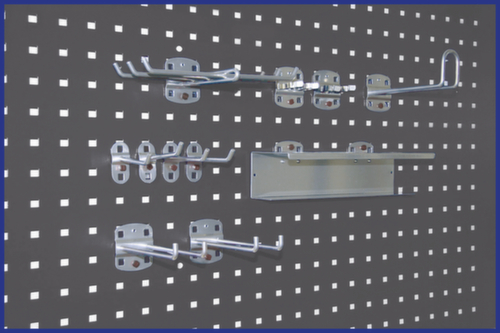 "value": "4 crochets simples, 2 doubles crochets, 2 pinces pour manche, porte-tuyau/porte-câble, porte-outils 6 emplacements, porte-flacons ronds 3 emplacements"