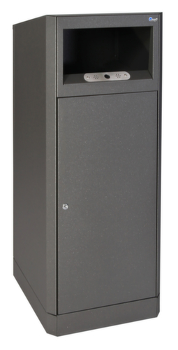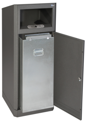 Les principales dimensions du stumpf cendrier poubelle Binox Hybrid-A en un coup d'œil :corps en Tôle d'acier de qualité avec revêtement en zinc anti-corrosion fer micacé. bac à cendres en acier inoxydable. avec couvercle avec ouverture d'introduction. couvercle avec cache-cendrier en acier inoxydable de qualité supérieure. auvent fer micacé. verrouillable avec serrure triangulaire. Le récipient se vide facilement par la porte battante et le seau intérieur amovible sans entraver sa stabilité.